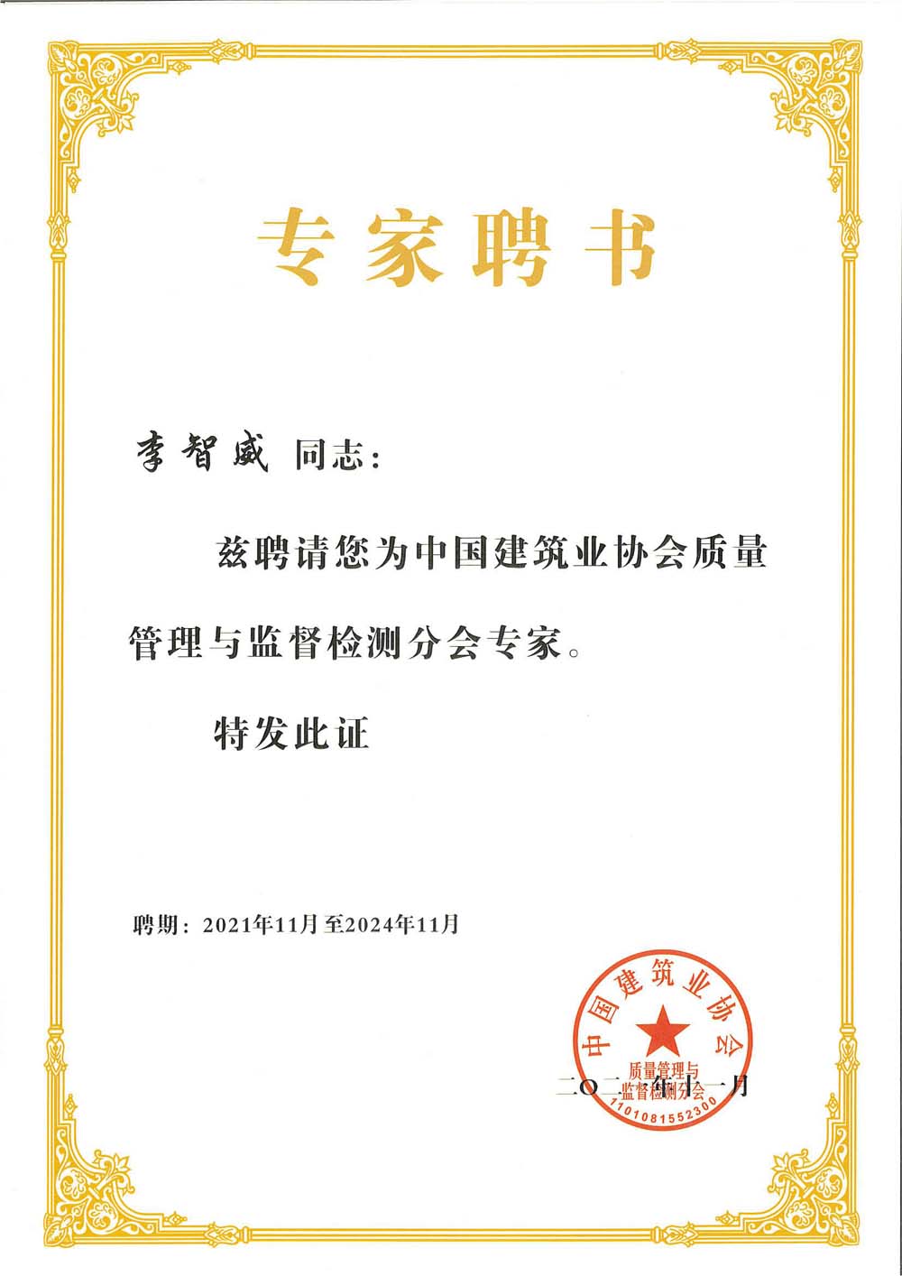 李智威被聘為中國建筑業(yè)協(xié)會質(zhì)量監(jiān)督檢測分會專家
