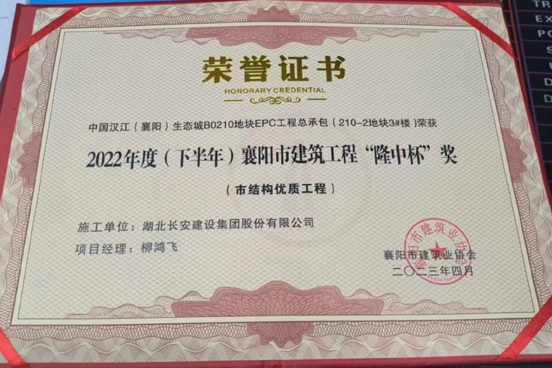 襄陽生態(tài)城B0210地塊(210-2地塊3#樓)榮獲“隆中杯”獎(市結(jié)構(gòu)優(yōu)質(zhì)工程)