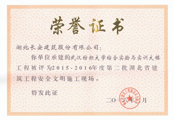 武漢紡織大學(xué)綜合實(shí)驗(yàn)與實(shí)訓(xùn)大樓被評為2015-2016年度第二批省安全文明施工現(xiàn)場
