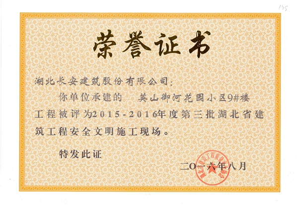 黃岡萬景城1#樓被評為2015-2016年度第二批省安全文明施工現(xiàn)場