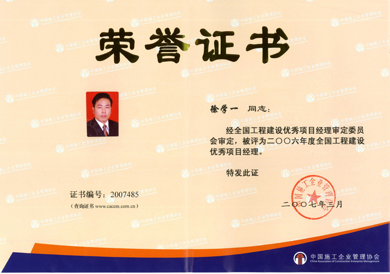 2006年度全國工程建設優(yōu)秀項目經(jīng)理(徐學一)