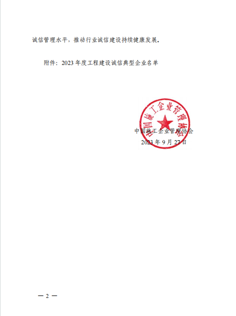 9月27日,中國(guó)施工企業(yè)管理協(xié)會(huì)公布“2023年度工程建設(shè)誠(chéng)信典型企業(yè)名單”,集團(tuán)公司榜上有名。這是集團(tuán)公司連續(xù)三年/次獲此殊榮。