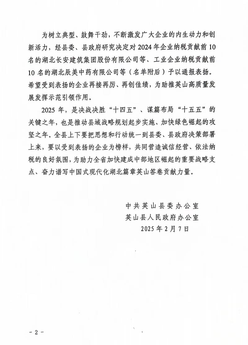 2月10日,英山縣2025年三級干部會議在英山縣禮堂召開。集團(tuán)公司榮庸“2024年度經(jīng)濟(jì)高質(zhì)量發(fā)展貢獻(xiàn)單位”稱號,在“2024年企業(yè)納稅貢獻(xiàn)排名前10位”中榮居第1位。