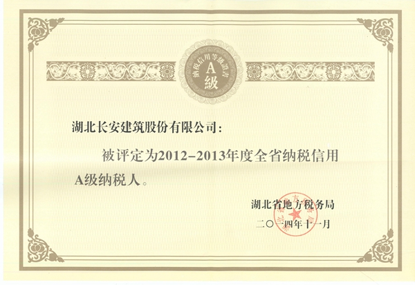 被評(píng)定為2012-2013年度全省納稅信用A級(jí)納稅人