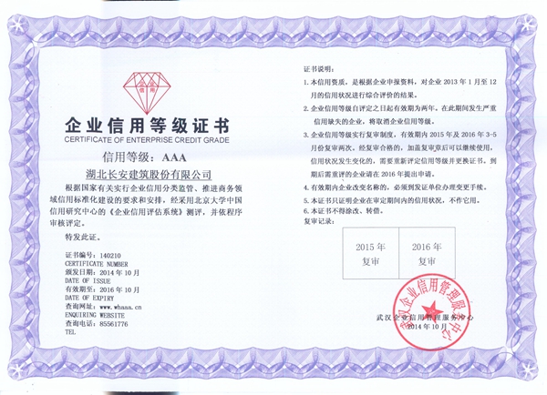 企業(yè)信用等級(jí)證書(shū)AAA武漢企業(yè)信用管理2014年10月至2016年10月