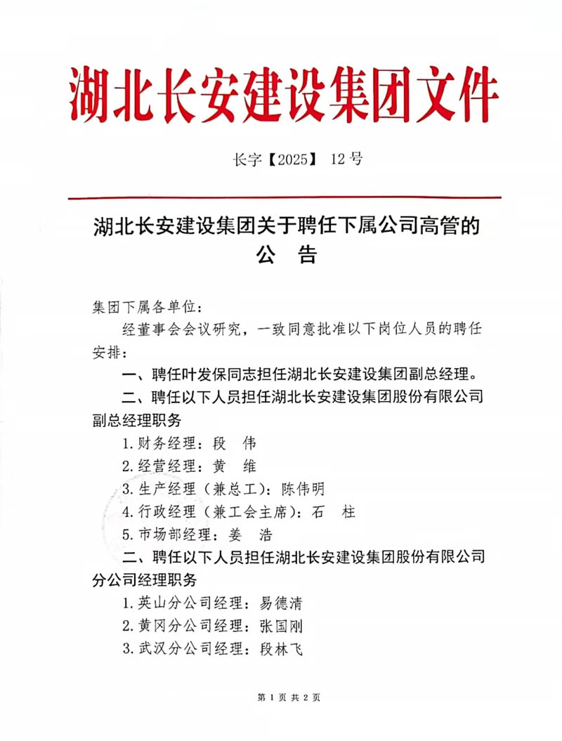 湖北長(zhǎng)安建設(shè)集團(tuán)關(guān)于聘任下屬公司高管的公告